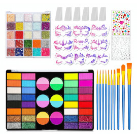 Vítejte v kouzelném světě kreativního líčení. Naše velká sada barev na tělo a obličej obsahuje 54 úžasných odstínů v praktické paletě, která vám umožní vytvářet neskutečné umělecké kreace. Ať už jste začátečník nebo zkušený malíř, tyto vysoce pigmentované a snadně nanášitelné barvy se dokonale rozprostírají a splývají. Barvy jsou bezpečné, netoxické a hypoalergenní, speciálně vyvinuté pro citlivou dětskou pleť.